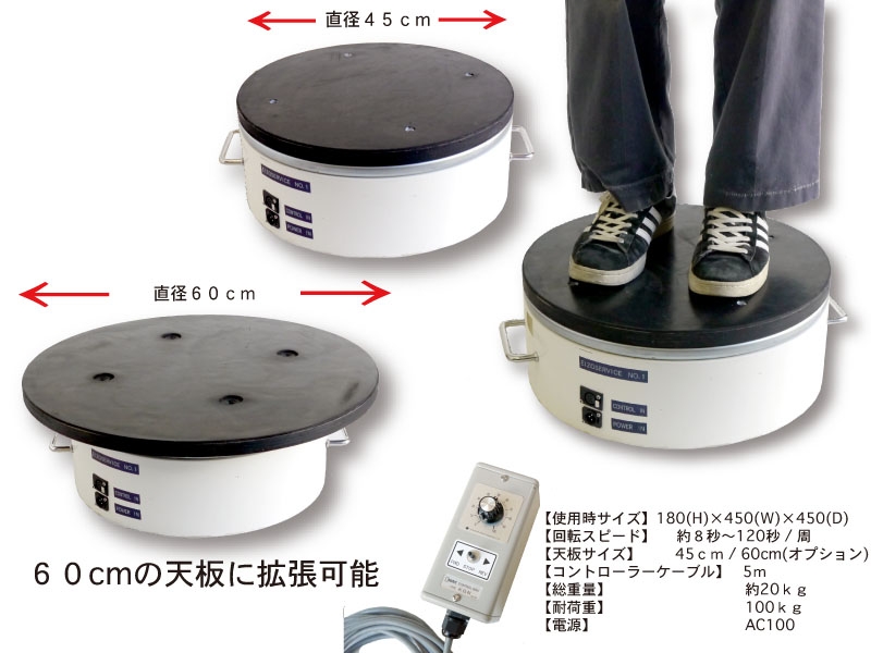 電動ターンテーブル450VSは、精度の高いスピード調節ができ、人乗りの回転撮影から、イベント等での商品展示まで幅広い用途で使用することができます。