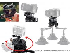 ギア付き回転ベースにはアクションカメラやDSLRカメラなどをクイックリリースプレートやアクションカメラ用ベースを介してマウントできます。